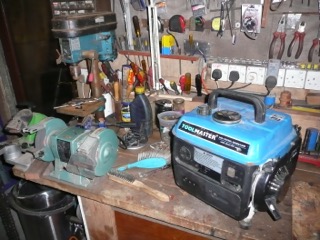 Anyway, I have been having lots of fun fixing up the machinery, and finding out what makes them tick, hum, chatter and spin. The drill press had the same problem as my wood lathe, the capacitor had blown - literally in this case - so onto eBay for a couple of 8 μF units. Fortunately the blown one had still got its specs on, and now both machines are working well. I was having such fun that I dug out the old petrol driven electricity generator that had been standing in a shed for years - not mine, I don't leave delicate stuff in damp sheds. (much) And with a bit of care and repair it runs nicely. The generator is the blue thing at the front right and the drill press, black and blue, is at the back left.